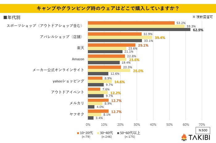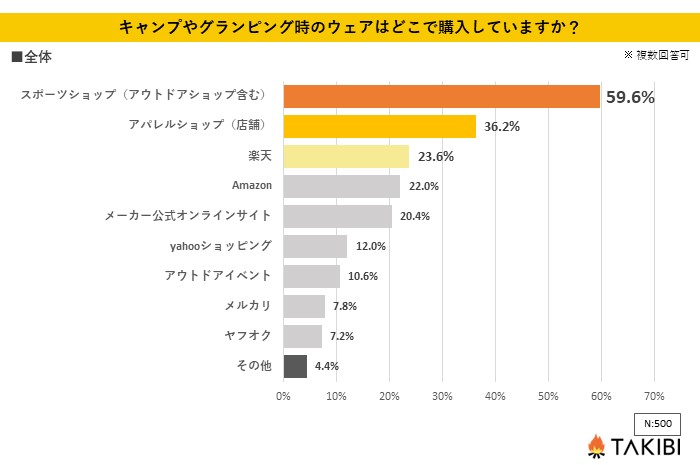 全国の10代~60代の男女を対象とした「キャンプやグランピング時のウェアはどこで購入していますか?」というアンケートを行ったところ、最も多かった回答は「スポーツショップ(アウトドアショップ含む)」で59.6%という結果になりました。次いで「アパレルショップ(店舗)」が36.2%、「楽天」が23.6%となっております。また、「その他」として「手持ちの服で組み合わせる」という回答が得られています。