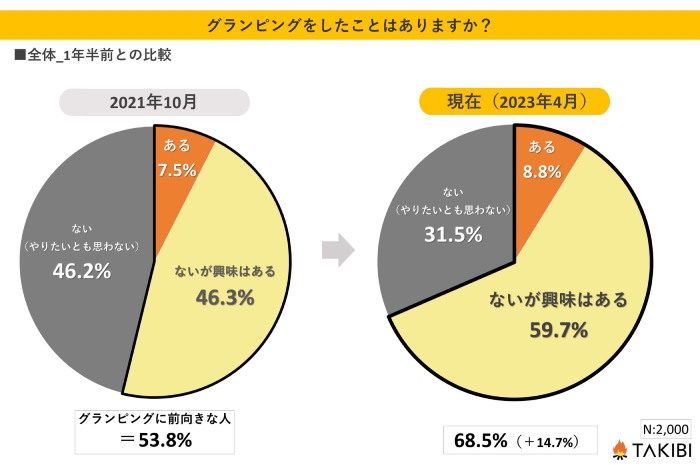 となり、実際にグランピングをした・興味を持っているなど、グランピングに対して前向きな方は14.7%増加している結果となりました。