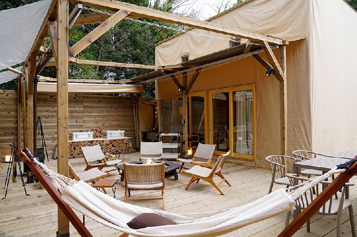 自然豊かな京都の清流に佇む、和風なグランピング施設。1等貸切で、プライベートな時間を過ごせます。清流を眺められるテラスでは、自然を感じながら京都ならではの食材を味わうことができますよ。また、ホテルのようなクオリティのアメニティも充実。アウトドア初心者や女性の方も、安心して宿泊できます。