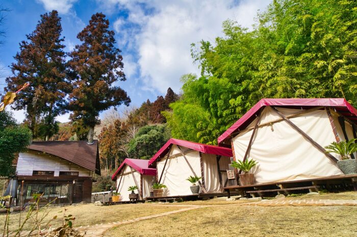 また、趣のある宿泊施設のほかに、テントやBBQサイトを自由に使えるのも良いところ。ニーズに応じてグランピング体験ができるので、メンバーの好みに合わせたスタイルでアウトドアを楽しめますよ!