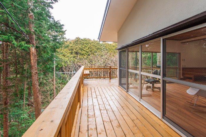 森の中の急斜面にせり出すような形で建っている貸し別荘。開放的なウッドテラスはまるで森の中に浮いているような感覚になります!
