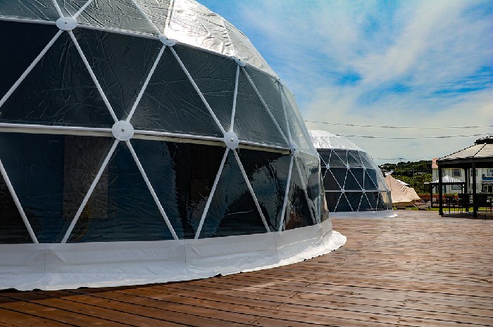 「スタンダードドーム」の大型グランピングドームテントは、断熱性に優れた2重張り構造となっています。リーズナブルにグランピングを楽しみたい場合におすすめの客室です。