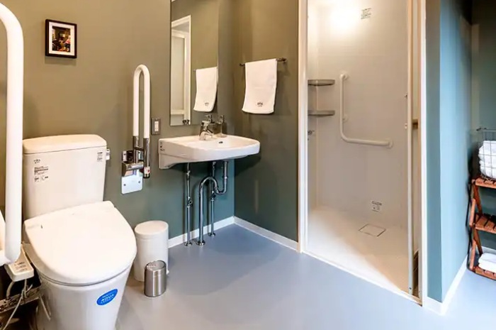 車椅子での利用を考えて設計されていて、出入り口の段差をなくしたり、シャワールームなどのドアを外して間口を開いてあるなど、車椅子でも使いやすい環境となっています。