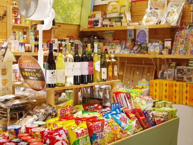 明るい店内に、キャンプに必要な日用品からお酒やお菓子など、様々なものが販売されています。