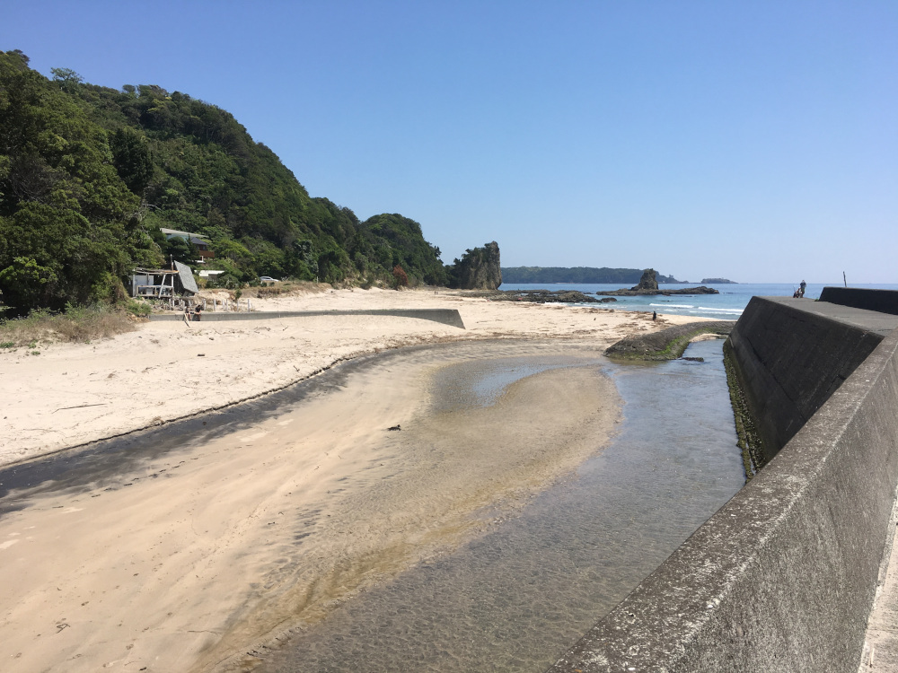 せっかく伊豆まで行くのだから釣りでもしようと考えていました。釣った魚をつまみにしようかと。けど、起きたら7時。朝マズメを逃しました…。急いで下田近くの堤防をいくつか回ってみましたが、さすがゴールデンウィーク満席御礼。静かな漁港を見つけ隅でエギを投げますが反応なし。ホンダワラもあるし墨跡もあるし…。まぁ下手なだけですな。
