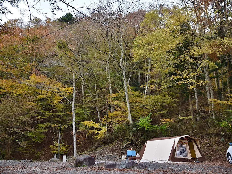 道志村のキャンプ場は水捌けの良い砂利のサイトが多いようで、このキャンプ場も細かな砂利が敷き詰められていました。