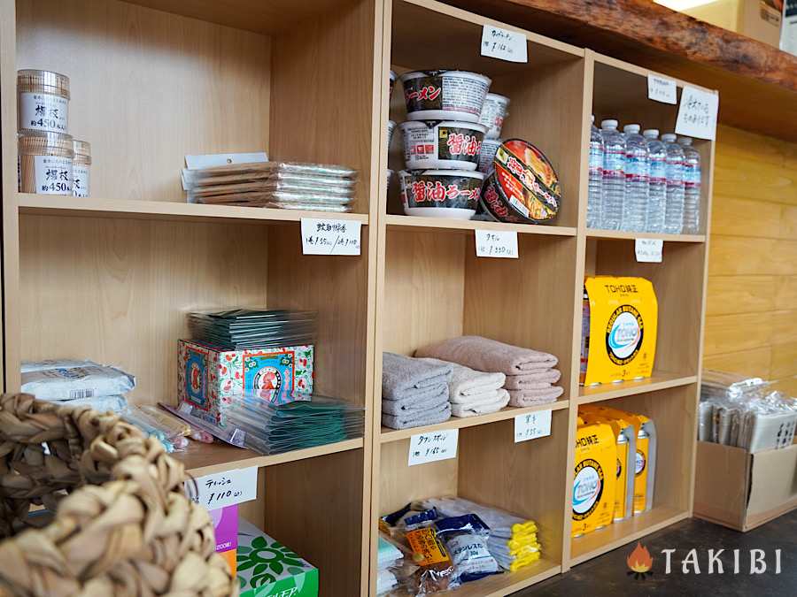 管理棟内にはガスボンベやカップラーメン、お水などが販売されていました。