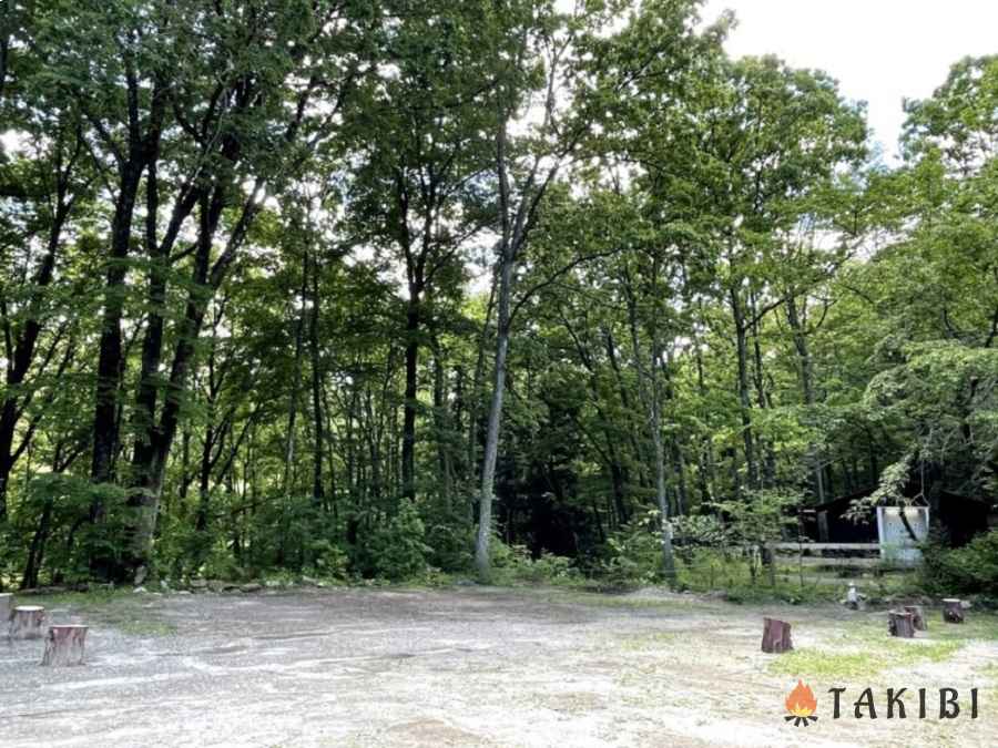 周囲は木に囲まれていますが、サイトには木がなく日当たりが良いため、夏や日差しの強い日はタープが必須です。そのぶん、晴れた日の夜には満点の星空を眺めるのに最高なロケーションです。