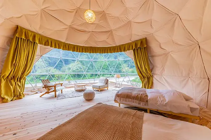 緑豊かな山々の景色や夜空に輝く星空を、贅沢にドームテント内から鑑賞可能!定員数は6名まで。