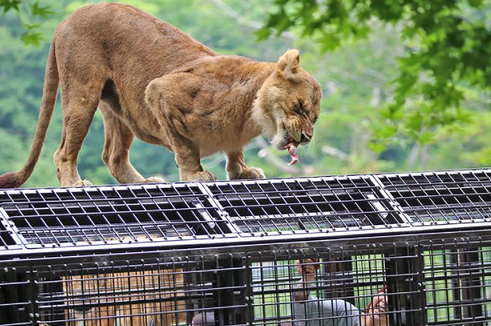 窓ガラスがなく、両側面が金網張りになっているバスに乗りながら、ライオンやクマへエサをあげることができます。息づかいが感じられるほどの距離まで動物たちが迫ってくる光景はスリルたっぷり。