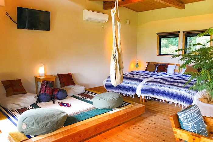 3つ目は、1日1棟限定のグランピングの雰囲気も楽しめるお部屋です。室内には子どもが喜ぶハンモックを設置。