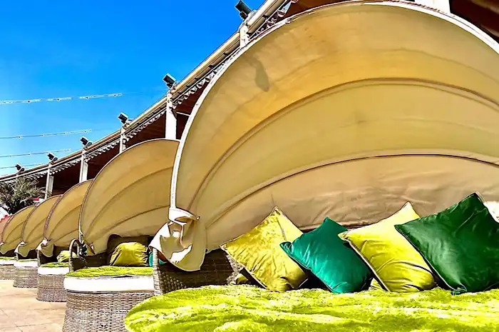 稼働式ルーフのくつろげるソファ席。ビーチ沿いのリゾート気分を味わえます。