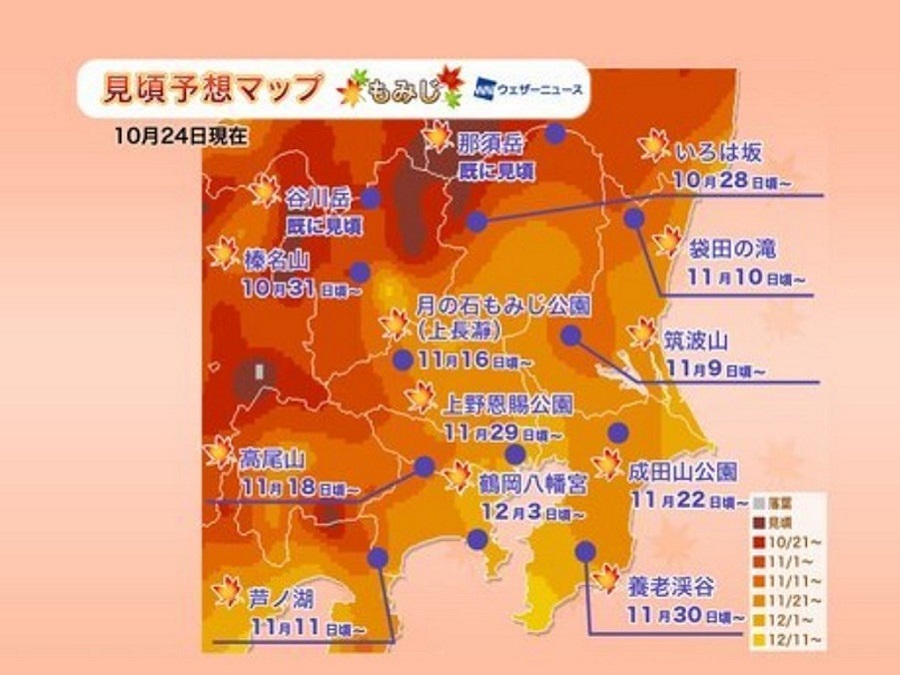 紅葉が始まる時期は、地域や標高によって違いがありますが、ウェザーニュースが発表した全国の紅葉の見頃(10月24日時点)では、今年は全国的には11月が見頃の季節となりそうです。また、関東地方の各地も上記の通りですが、これから紅葉の見頃を迎えることになりますね。