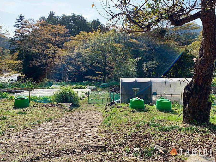 手前の緑のバケツはコンポスト。こちらには野菜くずのみ捨てることができます。(缶、ビンも別で捨てられます。)