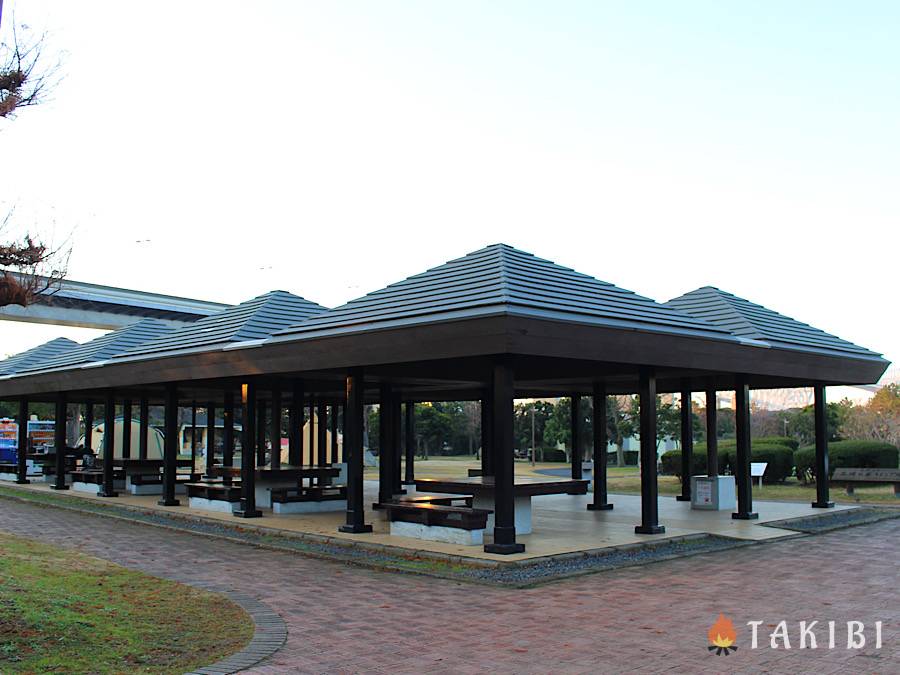 入り口付近にあります。大きな屋根がついています。休憩や、雨が降ってきた際に便利です。(※休憩舎の中でキャンプ、寝泊りやバーベキュー等はできません)