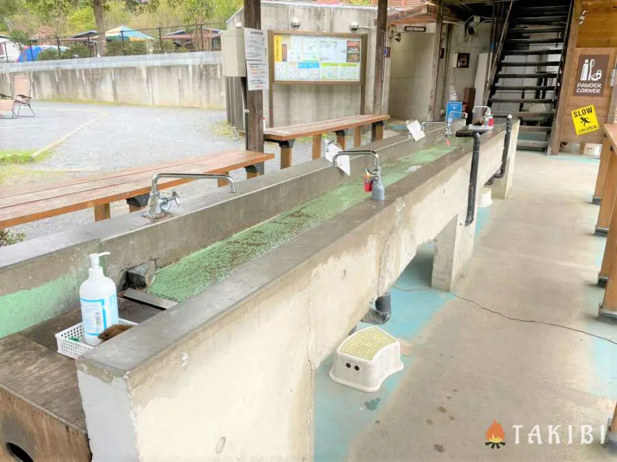 すぐ向かい側にある炭捨て場に炭を入れた後、こちらの洗い場でコンロや焚き火台を洗えます。