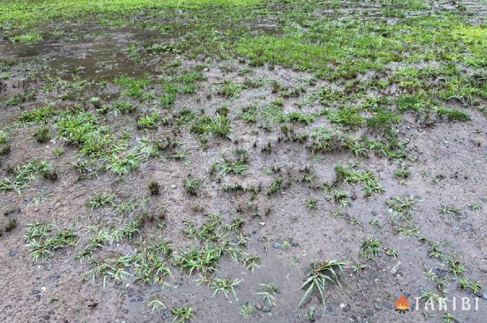 オートサイトキャンプ場の地面の様子です。砂利などは少なく、土と芝が混じったサイトです。