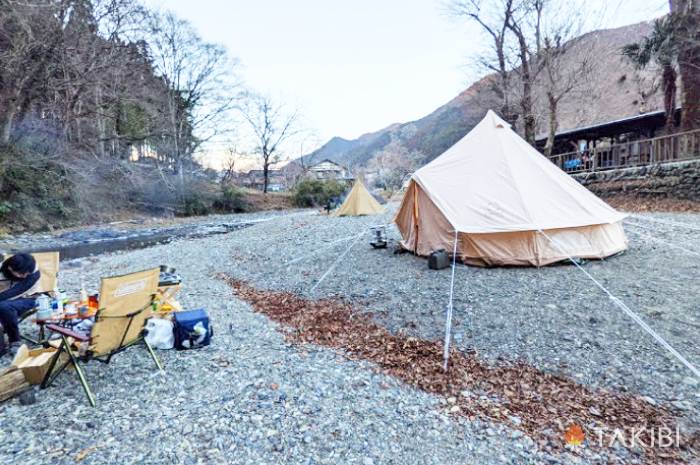 今回は河原フリーサイトの坂道を降りてすぐのあたりをキャンプ地としました!