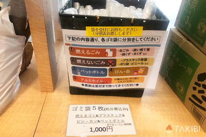 ゴミは基本的に持ち帰りですが、処分費込みのゴミ袋を購入すると回収してもらえるそうです。(5枚1000円)