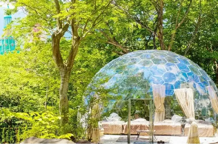 1つ目は、非日常感を存分に楽しめる「クリアドームテント」です。