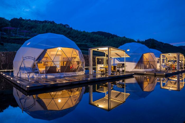 大阪府南部、岸和田市のグランピング施設です。日本初の水盤上に浮かぶドームテントでは、水面に映る牛滝渓谷の幻想的な風景を楽しめます。カップルでロマンチックな時間を過ごせるでしょう。