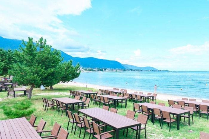 JR湖西線比良駅から歩いてすぐの場所にあるアクセスの良さも魅力的で、南国リゾートのような雰囲気が漂います。