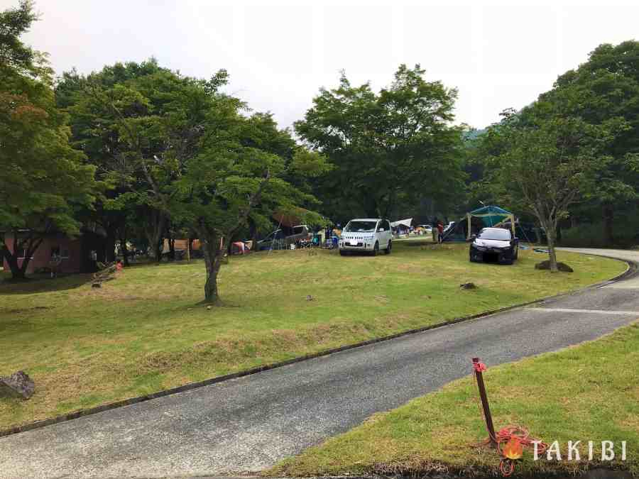 Eサイトは斜面にあるので、駐車場左奥の小道を車で上がっていきます。