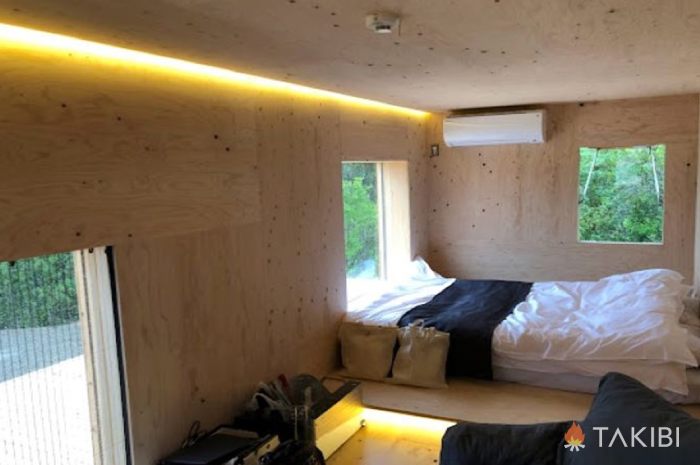 焚き火台、エアコン、ダブルベット、寝具、テーブル、クッション、照明、コンセント、LEDランタン、使い捨てスリッパ、アメニティセット、フェイスタオル、バスタオル、ナイトウェア、冷蔵庫、電気ケトル、チャッカマン、栓抜き、置き鏡、ドライヤー
