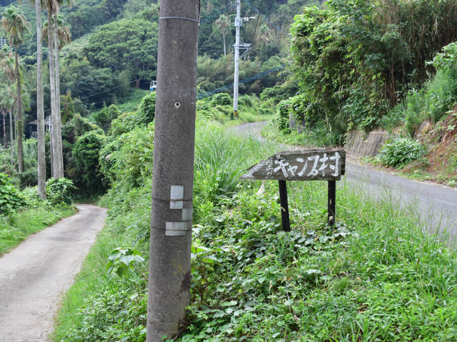 大型バスから降りた方はこの看板を右に曲がれば、急な下り坂が見えますので、下ったらキャンプ場に着きます!