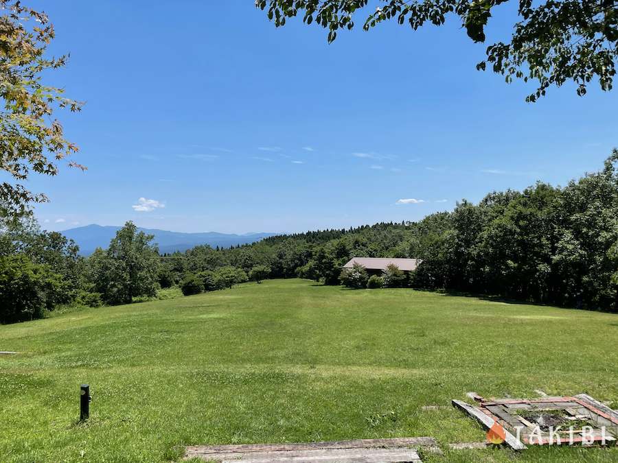 写真で見えている芝生の一番奥までがキャンプ場の敷地ですが、歩くと約5分ほどかかる距離があります。