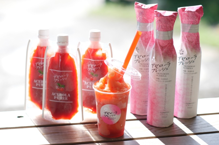 食べ物は、アセローラフレッシュ、もとぶかりゆし市場、道端の露天