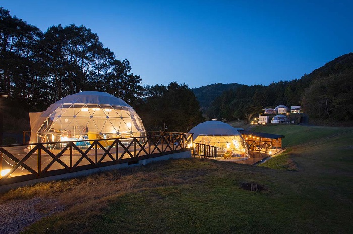 四万十町の山あいに位置するこの施設では、ドームテント、グランピングテント、トレーラーハウスでのグランピングが楽しめます。プライベートプールや露天風呂付きの区画もあり、ラグジュアリーな時間を存分に過ごせます。