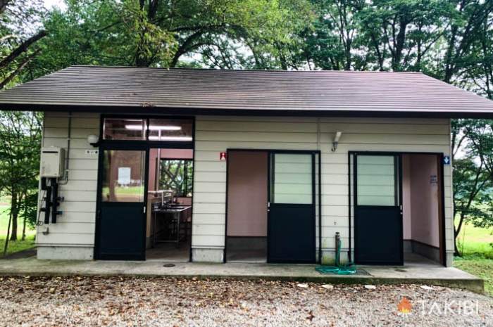 写真はサニタリーC棟です。この日は利用者が少なく、B棟は閉められていましたが、B棟とC棟の設備は同じでした。トイレと炊事場があり、夜も明かりがあるので安心です。