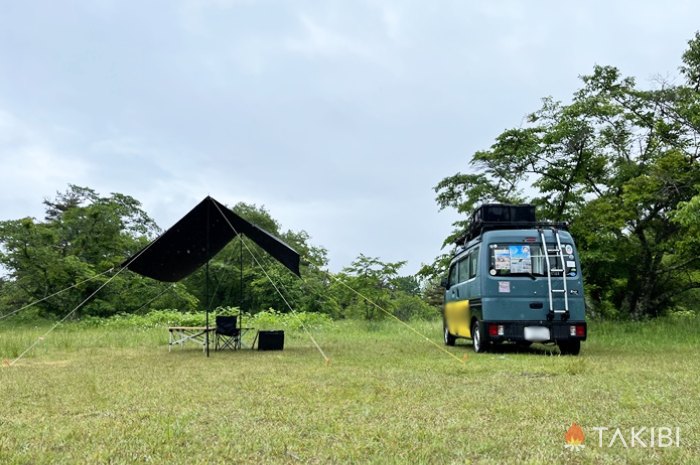 車は三菱のミニキャブバンという軽バンにGOGlampingのtcタープで設営しました。