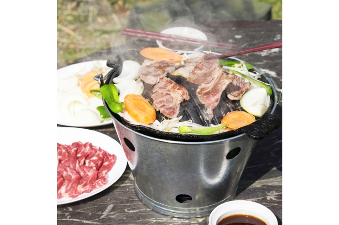 ・遠野のソウルフードのジンギスカン(バケツに穴をあけた専用の焼き台が、ホームセンターで販売されています。)