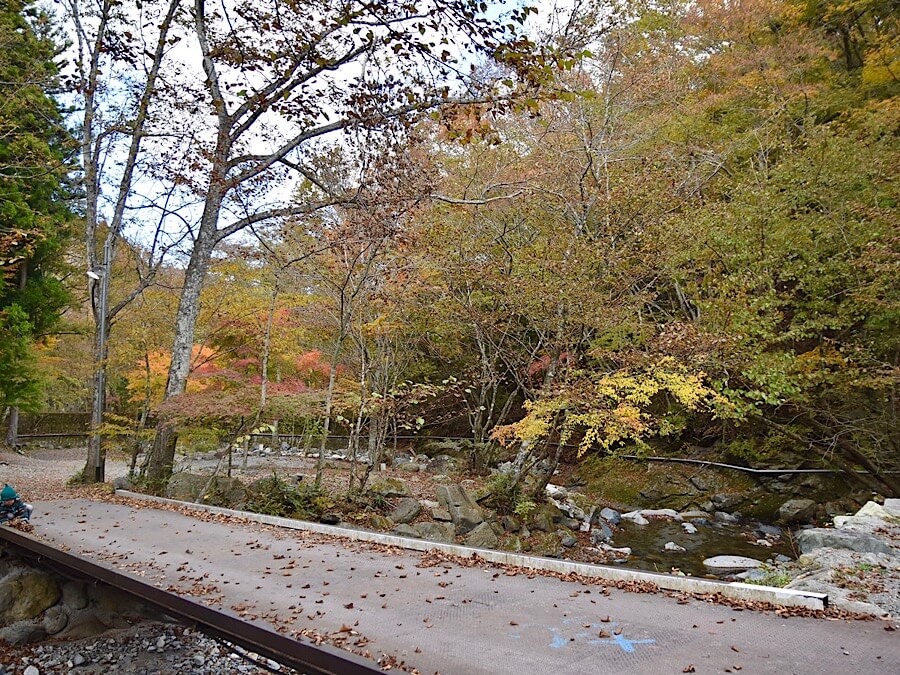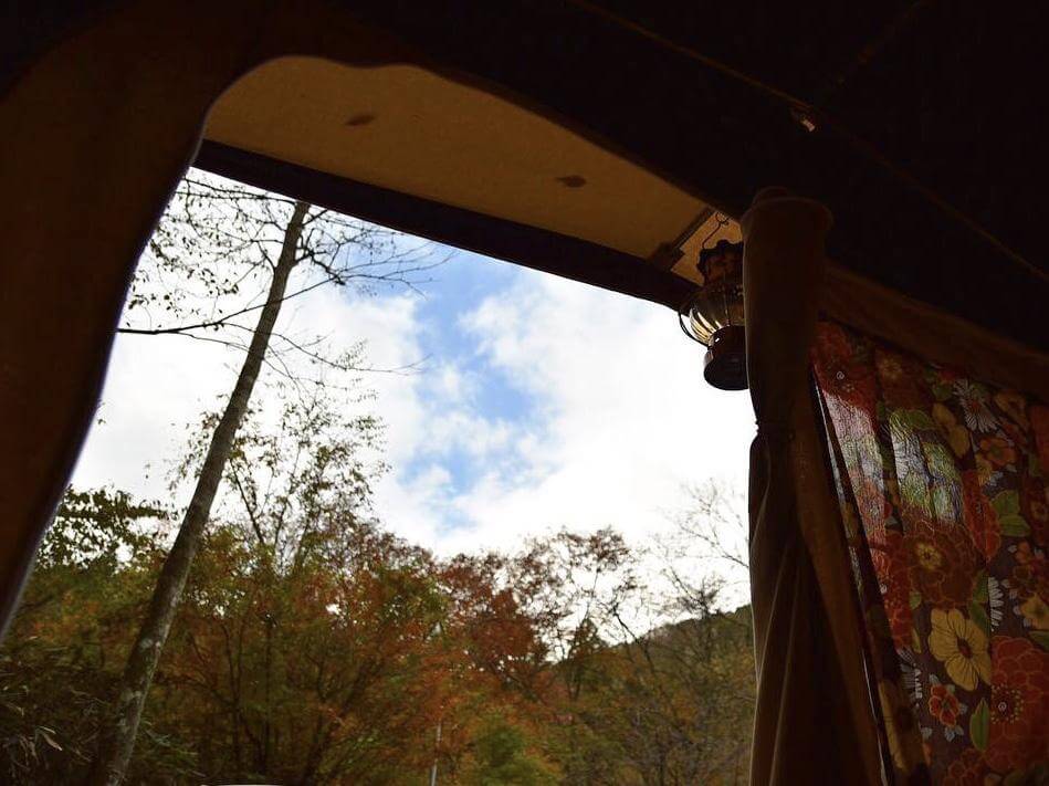山側は紅葉した木はあまりありませんでしたが、テントの中でゴロゴロしながら川側にある紅葉と青空のコラボレーションが見られました。