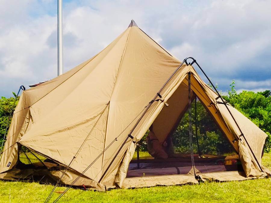 自然に溶け込める色合いで、女性でも簡単に設営、持ち運び可能なテントです。開口部が広く、空気の循環をよく考えてるのでワンポールにありがちな閉鎖的な感じがなく開放感がありオールシーズン使いやすいです。機能的なグランドシートもついて、コストパフォーマンスは最高だと思います。
