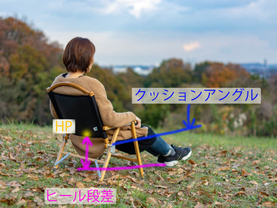 女性には座ってくれとだけお願いをしていますが、自然と足を延ばしていますね。カーミットチェアはコンパクトチェアなのでヒップポイント(HP:お尻の中心点)が低いんです。