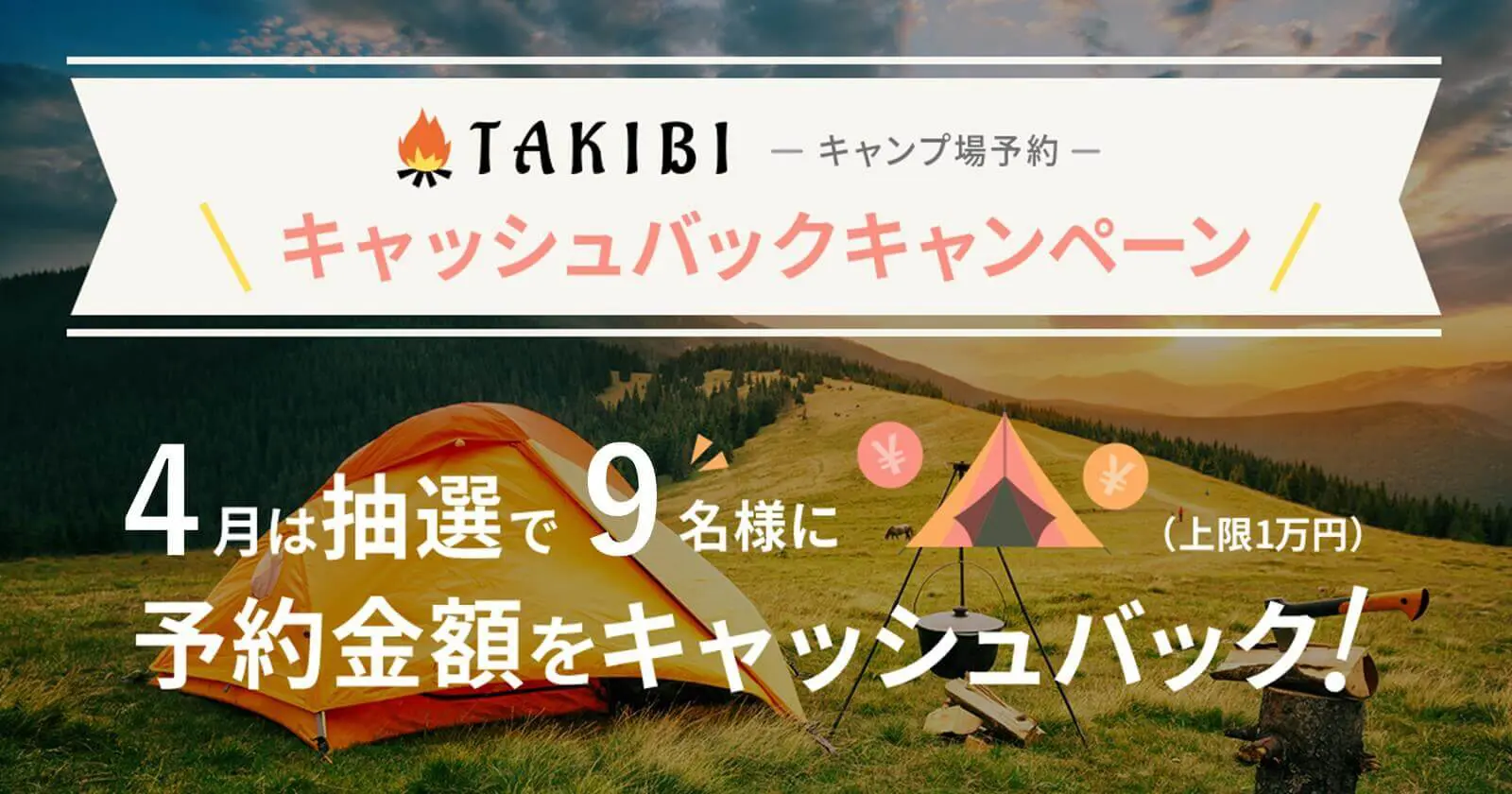 キャンペーン期間中に、TAKIBIキャンプ場予約から施設をご利用いただいた方の中から抽選で、1名様あたり上限1万円ずつ、合計で63万円分をキャッシュバックします!