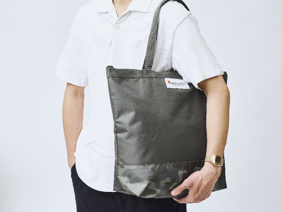 このトートバッグに使用されている素材は、コットン・ナイロン・ポリエステルの混紡された生地に、格子状にナイロン繊維を縫い付けている「リップストップ生地」を使用しています。