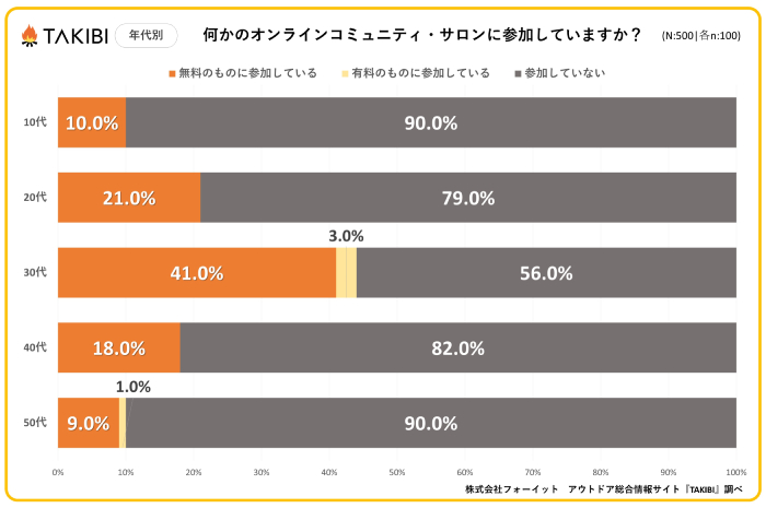 年代別で見ると、何らかのオンラインコミュニティやサロンに参加している人の割合は、10代と50代では10%、20代と40代では20%前後にとどまりました。