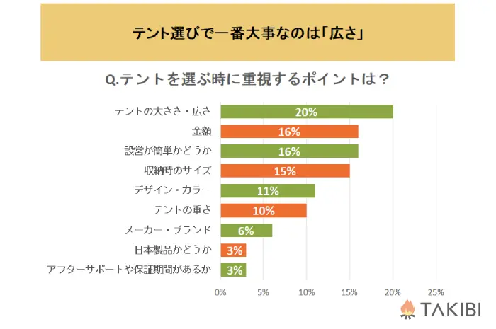 一番多かったのが「テントの大きさ・広さ(20%)」!キャンプする人数とテントの定員数はとても大事ですよね。