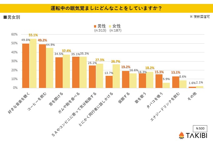 男性の回答が上回った項目を見てみると、コーヒーやエナジードリンクを飲む、タバコを吸う、など何かを摂取して眠気対策を取っているのに対し、女性では、とにかく同行者に話しかける、窓を開けるなど、環境を変えて対策を取る傾向にあるようです。