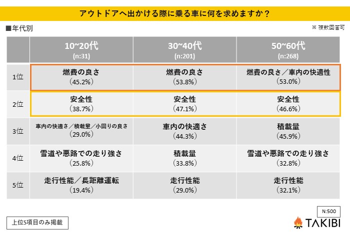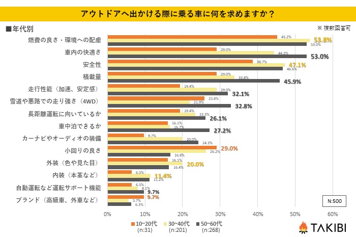 年代別に見ると、全ての年代において上位2項目は「燃費の良さ」と「安全性」という結果になりました。アウトドアへ出かける際に重視するポイントということもあり、長距離の運転を想定した項目に多く票が集まりました。